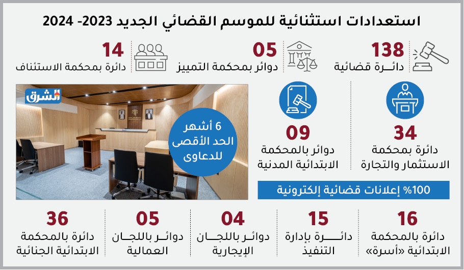 ينطلق الموسم القضائي الجديد بتحول رقمي كامل لكافة إجراءات التقاضي منذ بدء التسجيل حتى صدور الأحكام والقرارات وصولًا لتقديم طلبات تنفيذ الأحكام، والإجراءات التنفيذية الأخرى من المزادات الإلكترونية والإخلاءات والتي تضمنت خلال هذا العام إطلاق خدمة تسليم سندات الملكية للعقارات للمشتري وتدشين خدمة توصيل المركبات المباعة بالمزادات وتسليمها للمشتري.
