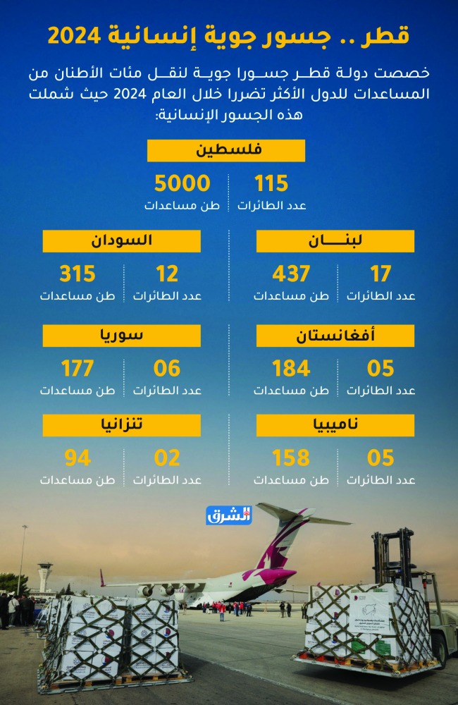 وأفادت وزارة الخارجية بأن قطر خصصت جسورا جوية لنقل مئات الأطنان من المساعدات للدول الأكثر تضررا حيث شملت هذه الجسور الإنسانية: 115 طائرة لفلسطين قطاع غزة بإجمالي مساعدات بلغت 5000 طن، و17 طائرة إلى لبنان بإجمالي مساعدات بلغت 437 طنا، و12 طائرة للسودان بإجمالي مساعدات بلغت 315 طنا، 5 طائرات لأفغانستان بإجمالي مساعدات بلغت 184 طنا، و6 طائرات إلى سوريا بإجمالي مساعدات بلغت 177 طنا، وناميبيا 5 طائرات بإجمالي مساعدات بلغت 158 طنا، وطائرتان لتنزانيا بإجمالي مساعدات بلغت 94 طنا. وقالت إن قطر استضافت العديد من المؤتمرات وشاركت في الكثير من المحافل الدولية، مؤكدة أن الحوار والدبلوماسية هما الطريق الأنجع لحل النزاعات وتعزيز الاستقرار الإقليمي والدولي. وأكدت وزارة الخارجية أن دولة قطر ستظل ملتزمة بكونها شريكا موثوقا في التنمية والأمن والسلم الدوليين.