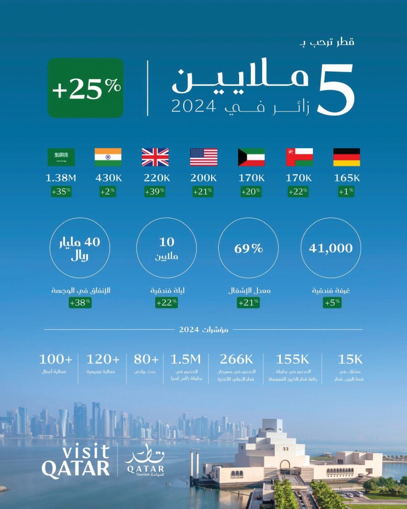 وقال سعادة السيد سعد بن علي الخرجي رئيس قطر للسياحة ورئيس مجلس إدارة Visit Qatar: « إن تجاوز حاجز الخمسة ملايين زائر في عام 2024 يُعد إنجازًا بارزًا يؤكد تحول قطر إلى واحدة من أبرز الوجهات العالمية الصديقة للعائلات، ويعكس هذا النمو الذي جاء بنسبة 25% على أساس سنوي مدى فاعلية استراتيجيتنا وتفاني شركائنا، ومع تطلعنا إلى المستقبل، نؤكد التزامنا بتحسين تجربة الزوار وتحقيق أهدافنا الطموحة بمضاعفة أعداد الزوار وزيادة مساهمة السياحة في الناتج المحلي الإجمالي بشكل كبير بحلول عام 2030».
