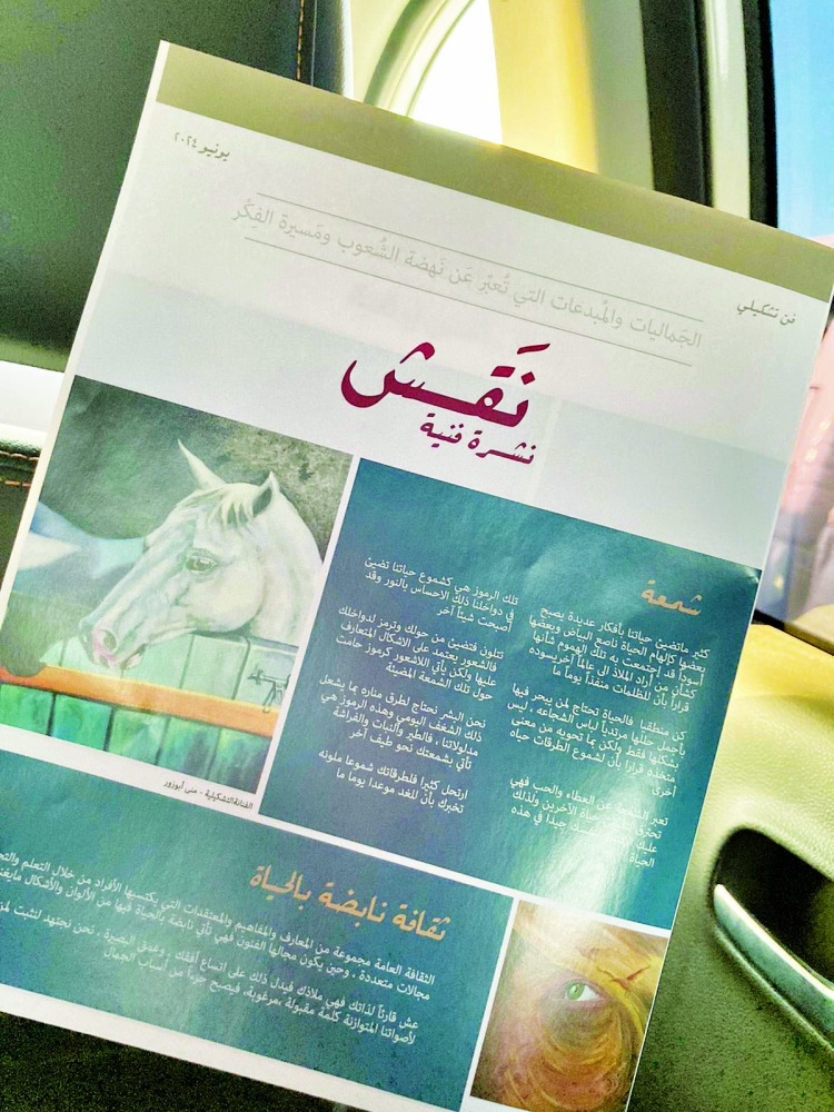 ولفتت لولوة المغيصيب الى أنها شاركت في معرض الصيف الذي أقامته الجمعية القطرية للفنون التشكيلية معربة عن شكرها للجمعية التي فتحت لها أبوابها وتبنت مشروع النشرة الفنية «نقش» التي ستحتفي بصدور عددها التاسع قريبا، وقالت إن فكرة إصدار النشرة بدأت في جائحة كوفيد – 19، وتغطي النشرة مختلف مجالات الإبداع على المستوى المحلي من بينها الفنون التشكيلية والشعر والموسيقى والأدب، ويساهم فيها شباب موهوبون ومبدعون محترفون.