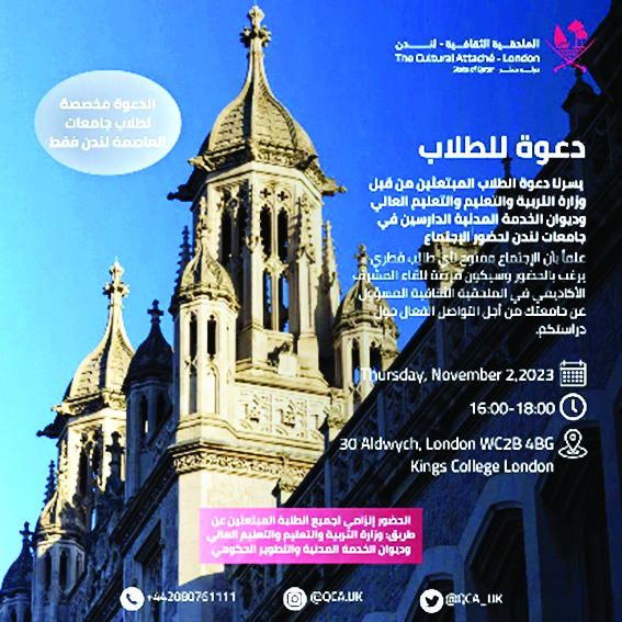 تعقد ملحقيتنا الثقافية لدى المملكة المتحدة وجمهورية أيرلندا اليوم اجتماعا تعريفيا لجميع أبنائنا الطلاب المبتعثين من وزارة التربية والتعليم والتعليم العالي وديوان الخدمة المدنية والتطوير الحكومي الدارسين في الجامعات البريطانية في لندن، وذلك في مبنى «بوش هاوس» مقر جامعة «كينجز كوليدج» البريطانية، حيث يتم استقبال أبنائنا الطلاب الدارسين في جامعات لندن، وتعريف كل طالب منهم بالمشرف الأكاديمي المخصص له من قبل الملحقية الثقافية، وسوف تقوم إدارة الملحقية بتسجيل بيانات الطلبة وتعريفهم بكافة الخدمات المقدمة لهم منذ بدء دراستهم وحتى تخرجهم. ودعت الملحقية جميع أبنائنا الطلبة لحضور الاجتماع، وخلال الاجتماع ستحدد طرق التواصل كل طالب ومشرفه الأكاديمي، لإزالة كافة الصعوبات التي تواجههم خلال الدراسة، كما سيتعرف الطلبة على طريقة التسجيل في الملحقية الطبية القطرية للحصول على الخدمات الطبية المميزة، وسيتم إخطار الطالب في حالة اكتمال عملية التسجيل بالبريد الالكتروني، كما تقوم الملحقية بتسجيل التأمين الطبي الدارسين على نفقتهم الخاصة. وتقوم الملحقية بالتواصل الدائم مع جميع طلابنا في المملكة المتحدة لتقديم الخدمات، إلى جانب عرض الأنشطة الرياضية والثقافية والفنية والوطنية وذلك بالبريد الالكتروني للطالب وعبر منصاتها بانستجرام «@QCA.UK» وإكس «@QCA_UK»، بجانب الرسائل عبر الأندية الطلابية. وتقدم الملحقية برامج وفعاليات للطلاب ومنها اللقاءات التعريفية بالتخصصات ومشاركة تجارب الخريجين لتقديم النصح للطلاب الجدد، كما تقيم ورشا تدريبية بالتعاون مع الجهات في قطر وبريطانيا.