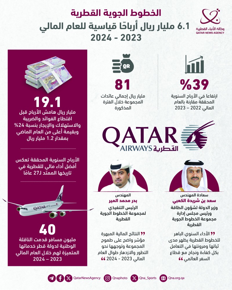 وأكمل المهندس المير قائلاً: «وقد اعتمدت المجموعة على تحقيق الأرباح وتطوير الكفاءة التشغيلية والارتقاء بتجربة العملاء وذلك من خلال اعتماد استراتيجية تختص بتنمية شبكة وجهاتها العالمية وتعزيز أسطول طائراتها والتي أدت إلى تحقيق أعلى نسبة عائدات وهامش أرباح في تاريخ الخطوط الجوية القطرية. ومن هذا المنطلق، نجحنا في ترسيخ مكانتنا العالمية كشركة طيران رائدة تتصدر قائمة شركات الطيران المفضلة لدى ملايين المسافرين من مختلف أنحاء العالم».