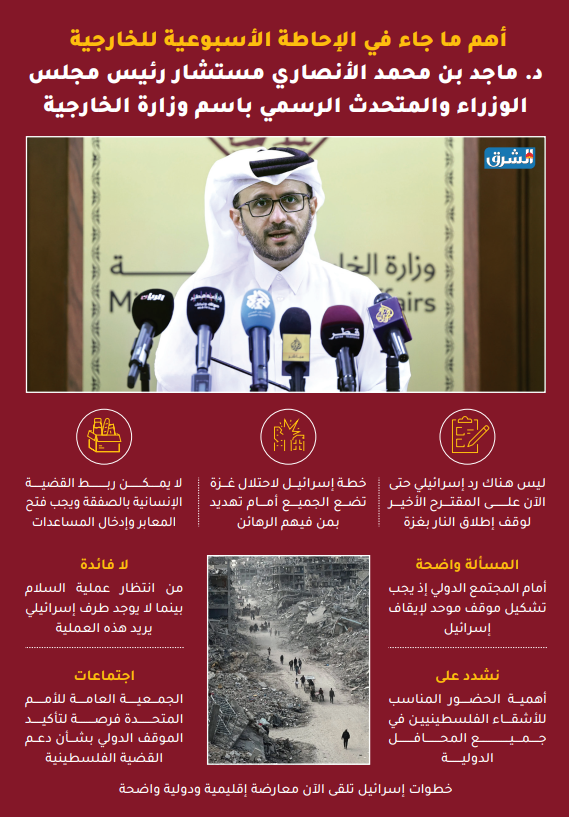 أكد الدكتور ماجد بن محمد الأنصاري، مستشار رئيس مجلس الوزراء والمتحدث الرسمي باسم وزارة الخارجية، أن إسرائيل لم تقدم حتى الآن أي رد على المقترح الأخير المتعلق بوقف إطلاق النار في غزة، مشيرًا إلى أن ما تشهده الساحة من تصعيد متواصل لا يدل على وجود نية حقيقية للوصول إلى اتفاق.