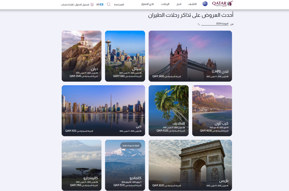 أظهرت أحدث عروض الخطوط الجوية القطرية على تذاكر رحلات الطيران للدرجة السياحية من الدوحة، أسعاراً متفاوتة حسب الوجهة.