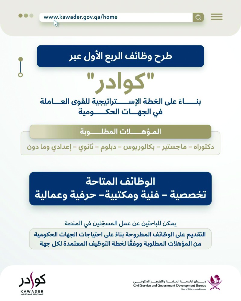 وبناء على الخطة الإستراتيجية للقوى العاملة في الجهات الحكومية تم طرح وظائف الربع الأول لعدد من المؤهلات والتي تشمل الدكتوراه والماجستير والبكالوريوس والدبلوم والثانوي والإعدادي وما دون أما الوظائف المطروحة هي الوظائف التخصصية والفنية والمكتبية والوظائف الحرفية والعمالية ويمكن للباحثين عن عمل المسجلين في المنصة التقديم على الوظائف المطروحة بناء على احتياجات الجهات الحكومية من المؤهلات المطلوبة ووفقا لخطة التوظيف المعتمدة لكل جهة..