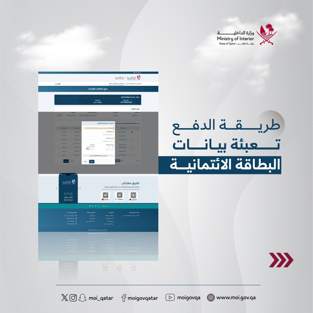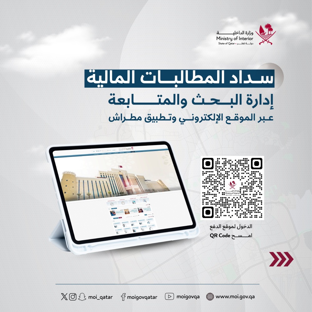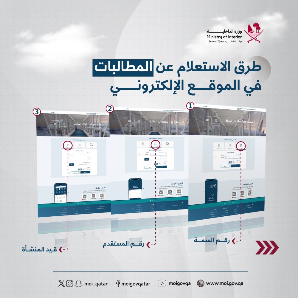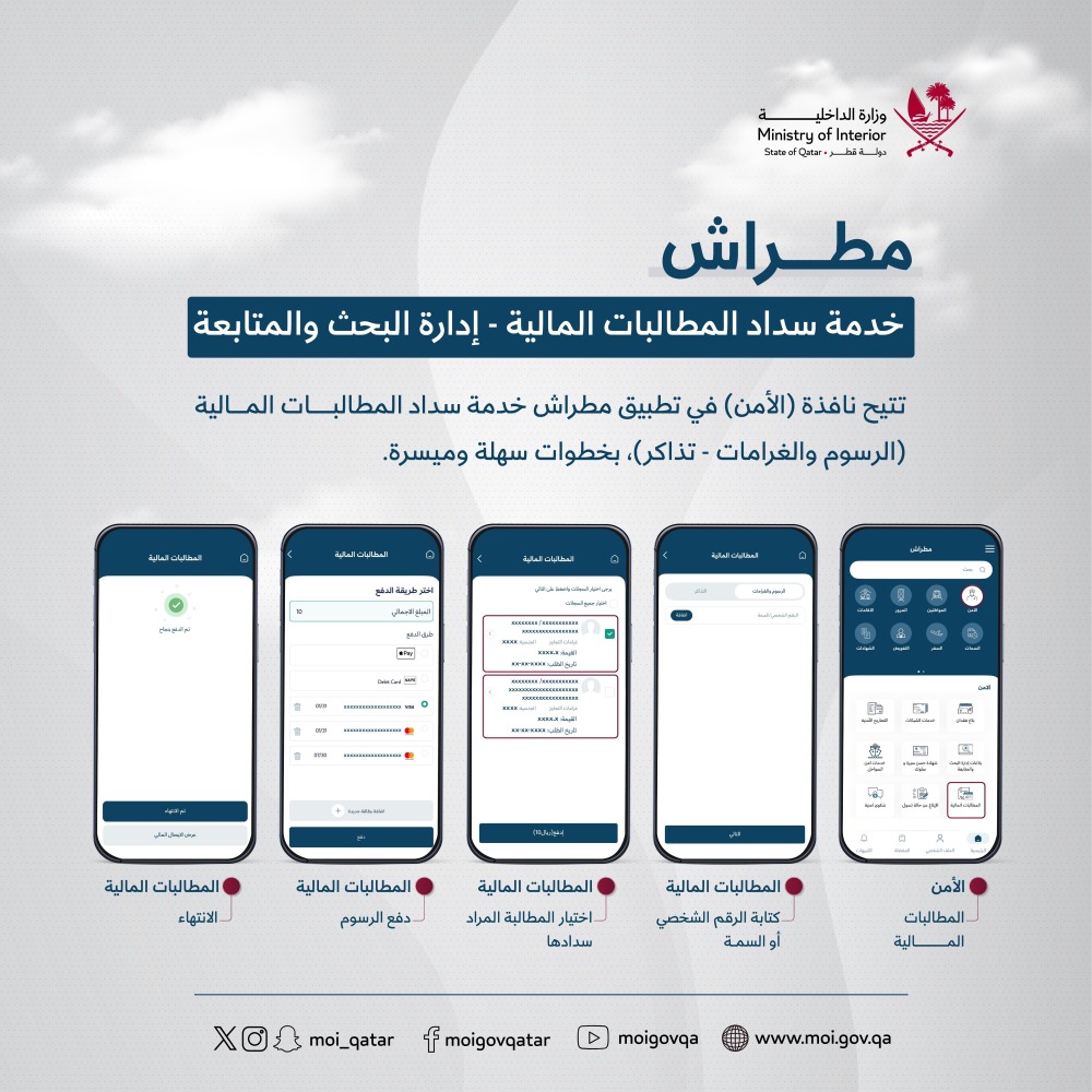 وأشارت وزارة الداخلية إلى أن نافذة الأمن في تطبيق مطراش تتيح خدمة سداد المطالبات المالية (الرسوم والغرامات – تذاكر)، بخطوات سهلة وميسرة، عبر الخطوات التالية: