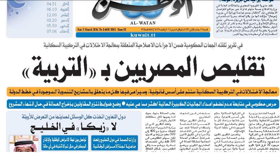 وقالت صحيفة "الوطن" الكويتية، إن الحكومة "تلقت تقريراً يتعلق بالتركيبة السكانية ومعالجتها ضمن الخطوات الإجرائية؛ للبدء في معالجة الاختلالات في التركيبة السكانية".