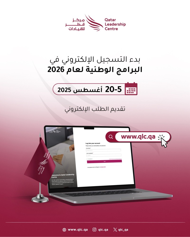 في إطار جهوده المتواصلة لبناء قيادات وطنية مؤهلة تقود مسيرة التنمية في مختلف القطاعات، أعلن مركز قطر للقيادات عن فتح باب التسجيل للالتحاق بالبرامج الوطنية للعام 2026، وذلك ابتداءً من الثلاثاء 5 أغسطس، وحتى يوم الأربعاء 20 أغسطس 2025.