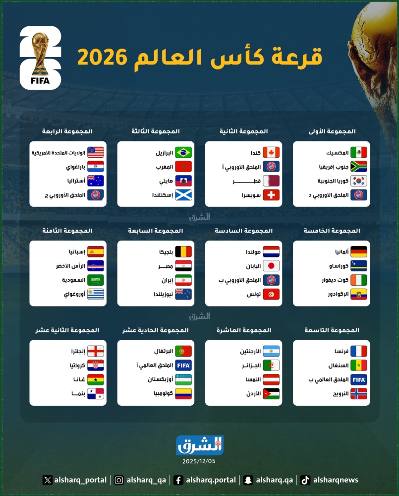 أسفرت قرعة كأس العالم 2026 المقامة في واشنطن، مساء اليوم الجمعة، عن تحديد المنتخبات التي ستكون في صدارة المجموعات في البطولة التي تستضيفها الولايات المتحدة الأمريكية وكندا والمكسيك.