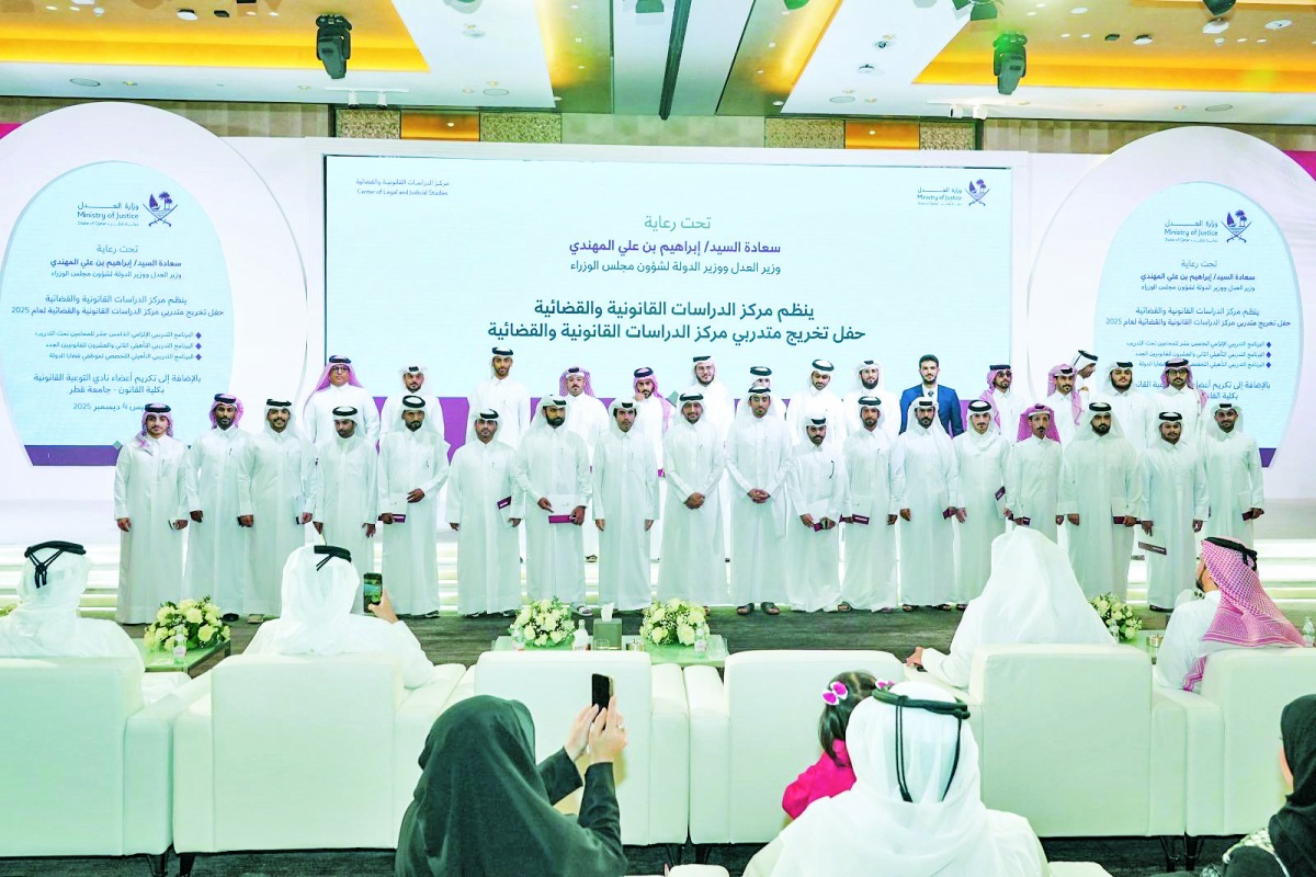 وشهد الحفل تخريج 183 قانونياً قطرياً استفادوا من البرامج التأهيلية والتخصصية التي نظمها المركز خلال عام 2025، من بينهم 83 قانونياً من منتسبي البرنامج التدريبي الثاني والعشرين للقانونيين الجدد، و20 محامياً تحت التدريب أنهوا دوراتهم التخصصية لعام 2025 في مركز الدراسات القانونية والقضائية بالوزارة، إضافة إلى 20 مشاركاً في البرنامج التأهيلي التخصصي لموظفي قضايا الدولة، وهو البرنامج الذي يُنظّم للمرة الأولى في سبيل تعزيز كفاءة منتسبي قطاع قضايا الدولة. وسلّم سعادة الوزير الخريجين شهادات التخرج، وهنّأ منتسبي مختلف الفئات القانونية، متمنياً لهم التوفيق في مسيرتهم العملية. وفي كلمة بالمناسبة، أكّد سعادته الأولوية التي توليها وزارة العدل لبناء وتطوير القدرات القانونية الوطنية، لافتاً إلى البدء في مرحلة جديدة تركز على دعم التدريب القانوني المتخصص، وتمكين الشباب القانونيين والمحامين من أدوات المعرفة الحديثة، بما يضمن توفير خدمات قانونية رائدة تقوم على المهنية والدقة والالتزام بأعلى معايير الجودة والكفاءة.