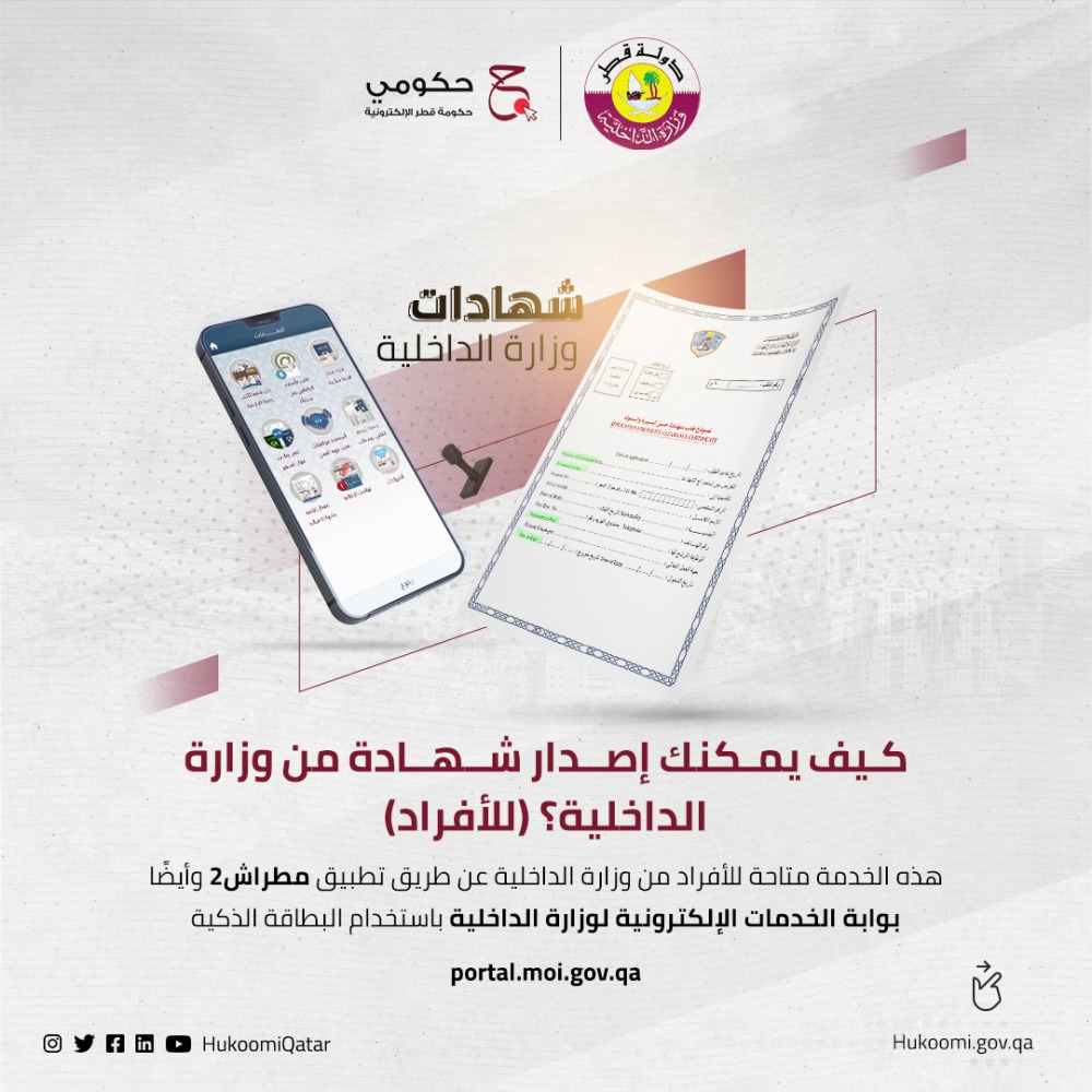 ذكّرت بوابة حكومة قطر الإليكترونية "حكومي" عموم الجماهير بالشهادات التي يمكن للأفراد والشركات الحصول عليها من خلال تطبيق مطراش2 أو بوابة الخدمات الإلكترونية لوزارة الداخلية.