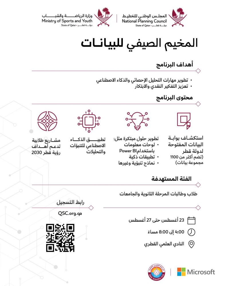 يطلق المجلس الوطني للتخطيط من خلال مركز الإحصاء الوطني، المخيم الصيفي للبيانات بالتعاون مع وزارة الرياضة والشباب، النادي العلمي القطري، ومايكروسوفت، وذلك خلال الفترة من 23 أغسطس حتى 27 أغسطس من 4 عصراً إلى 8 مساءً في النادي العلمي القطري.