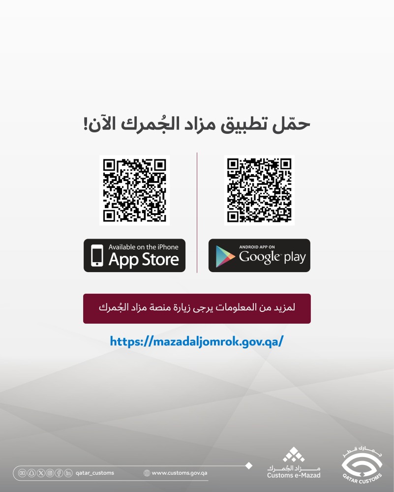 دعت الهيئة العامة للجمارك المهتمين للمشاركة في المزاد العلني الإلكتروني الذي يضم أكثر من 160 صنفاً من البضائع المتنوعة والمميزة وذلك على تطبيق "مزاد الجمرك" بتاريخ 14 - 15 أكتوبر 2025.