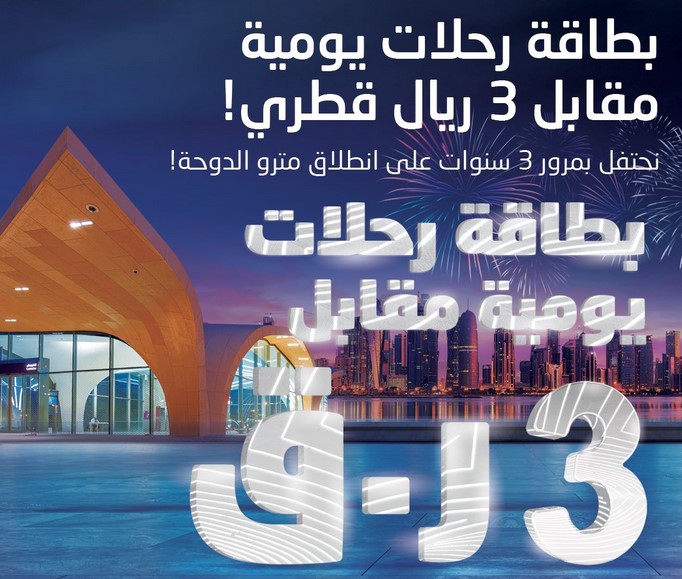 وقال حساب المترو بموقع تويتر في تغريدة: قم بشراء بطاقة الرحلات اليومية بمناسبة الذكرى الثالثة وتنقل طوال اليوم مقابل 3 ريال قطري فقط!
