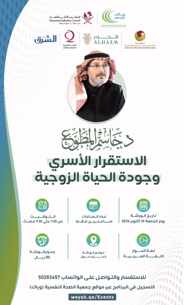 تنظم جمعية أصدقاء الصحة النفسية (وياك) وبمناسبة اليوم العالمي للصحة النفسية ورشة بعنوان “الاستقرار الأسري وجودة الحياة الزوجية” يوم الجمعة المقبل في العاشر من أكتوبر الجاري في حزم مول، من الساعة السابعة والنصف مساء حتى التاسعة والنصف بالتعاون مع إدارة التصالح الأسري بالمجلس الأعلى للقضاء برعاية من قطر الخيرية ومؤسسة جاسم وحمد بن جاسم الخيرية، وإدارة الحزم مول كشريكٍ لوجستيٍ وداعمٍ رئيسي للمبادرات المجتمعية، و "الشرق" راعياً إعلامياً للحدث. وقال د. عايض بن دبسان القحطاني رئيس جمعية الصحة النفسية إن الورشة المعنية تجيء انطلاقًا من رؤية قطر الوطنية 2030 التي تضع الإنسان في قلب التنمية الشاملة، وتزامنًا مع اليوم العالمي للصحة النفسية الذي يصادف العاشر من أكتوبر من كل عام. وأكد د. القحطاني في مؤتمر صحفي أن الاهتمام بالصحة النفسية للأسرة يمثل حجر الزاوية في تحقيق الاستقرار الاجتماعي وجودة الحياة، وأن الاستثمار في الإنسان نفسيًا واجتماعيًا هو الطريق الأمثل لتحقيق التنمية المستدامة التي تنادي بها رؤية قطر 2030. ولفت إلى أن «مناسبة اليوم العالمي للصحة النفسية تذكيرٌ سنوي بأهمية تضافر الجهود لنشر الوعي النفسي في المجتمع.. وقال نحن في جمعية وياك نؤمن بأن الاستقرار الأسري هو أساس الصحة النفسية للمجتمع القطري، ونعمل باستمرار على تعزيز الوعي الأسري وتمكين الأفراد من مهارات التواصل والحوار الإيجابي.