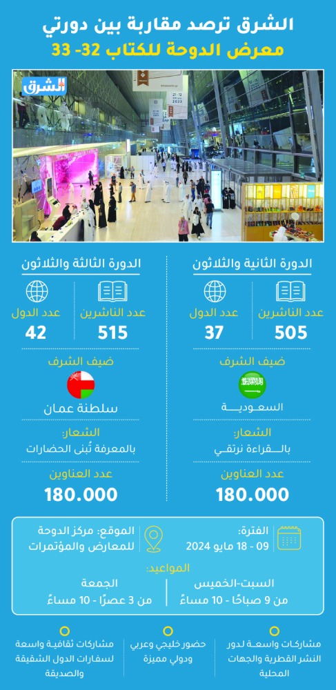 على قدم وساق، تُجرى الاستعدادات حالياً في مركز الدوحة للمعارض والمؤتمرات، لاحتضان النسخة الثالثة والثلاثين لمعرض الدوحة الدولي للكتاب، والذي ينطلق صباح غد، ويتواصل حتى 18 مايو الجاري، تحت شعار «بالمعرفة تُبنى الحضارات».