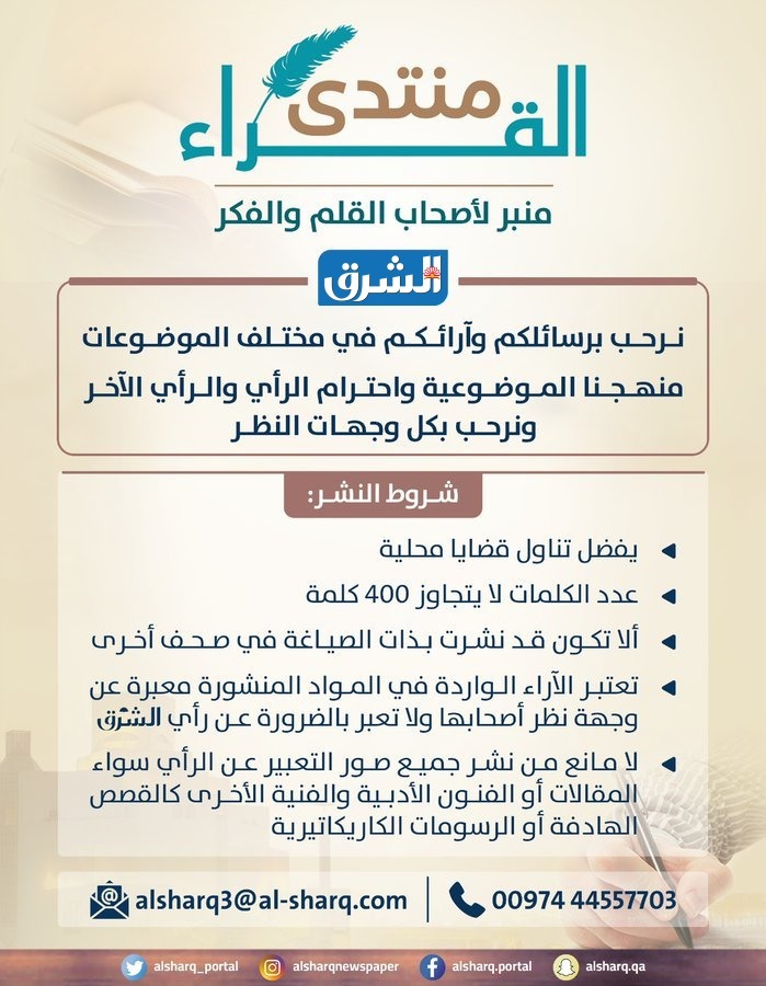ترحب الشرق برسائلكم وآرائكم في مختلف الموضوعات لنشرها في منتدى القراء بالصحيفة والموقع الإلكتروني، الجمعة من كل أسبوع.