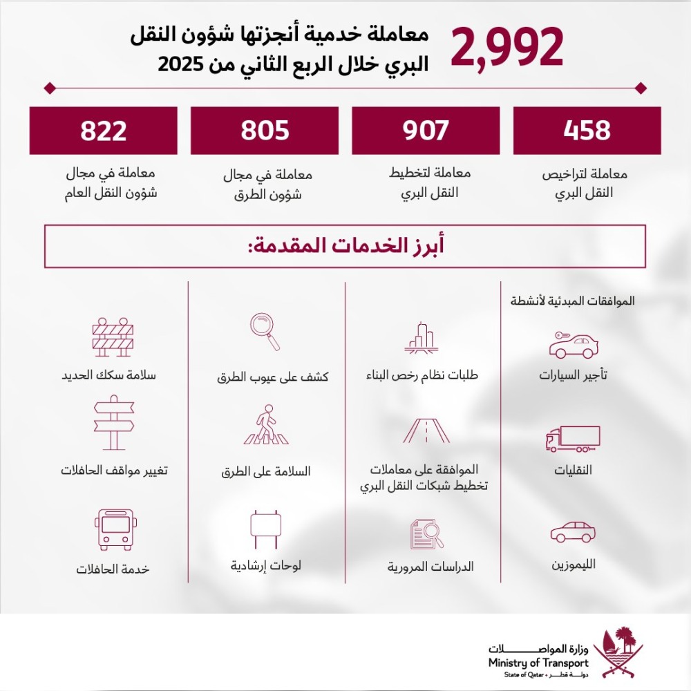 أعلنت وزارة المواصلات عن إنجاز شؤون النقل البري 2992 معاملة خدمية في الربع الثاني من 2025 بينها تغيير مواقف الحافلات وموافقة مبدئية لتأجير السيارات.
