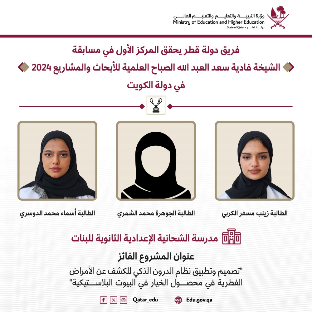 أحرزت طالبات من دولة قطر المركز الأول في مسابقة الشيخة فادية سعد العبد الله الصباح العلمية للأبحاث والمشاريع 2024 للمرحلتين الإعدادية والثانوية.