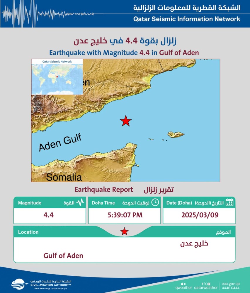 أفادت الشبكة القطرية للمعلومات الزلزالية بحدوث زلزال بقوة 4.4 في خليج عدن اليوم الأحد في تمام الساعة 5:39 دقيقة مساءً بتوقيت الدوحة، بحسب "أرصاد قطر" عبر منصة "إكس".