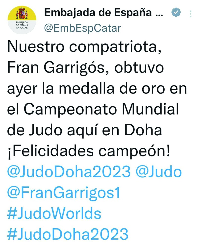 وغردت السفارة الاسبانية بدولة قطر على حسابها الرسمي بموقع تويتر للتواصل الاجتماعي وقالت" فاز مواطننا فران جاريجوس بالميدالية الذهبية أمس في بطولة العالم للجودو هنا في الدوحة، مبروك أيها البطل" .