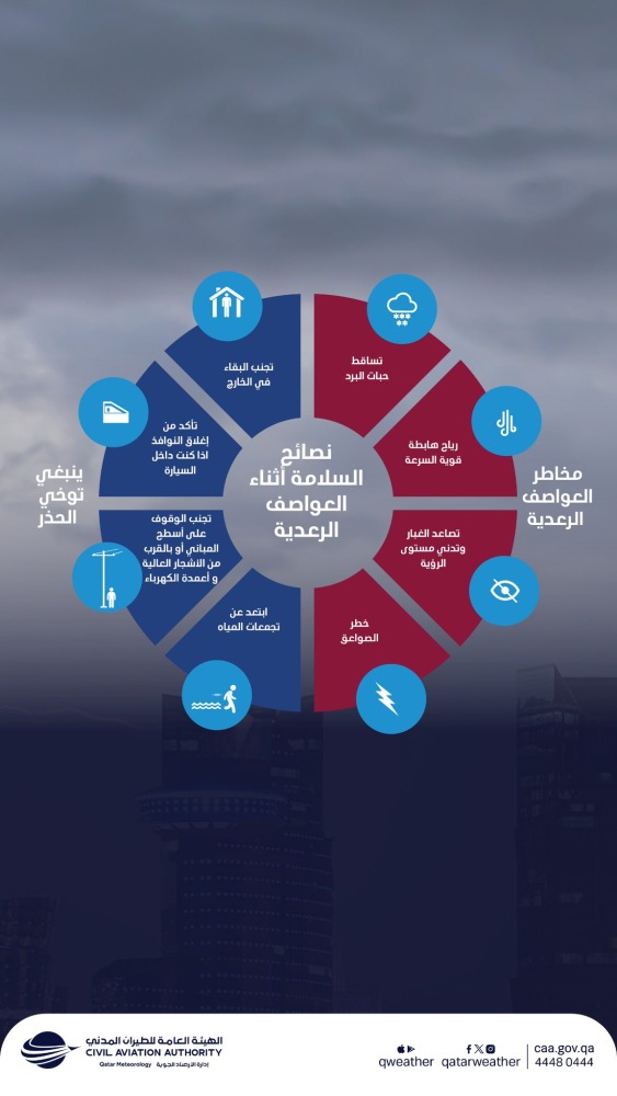 تجنب البقاء في الخارج، والتأكد من إغلاق النوافذ إذا كنت داخل السيارة، وتجنب الوقوف على أسطح المباني أو بالقرب من الأشجار العالية وأعمدة الكهرباء، والابتعاد عن تجمعات المياه.
