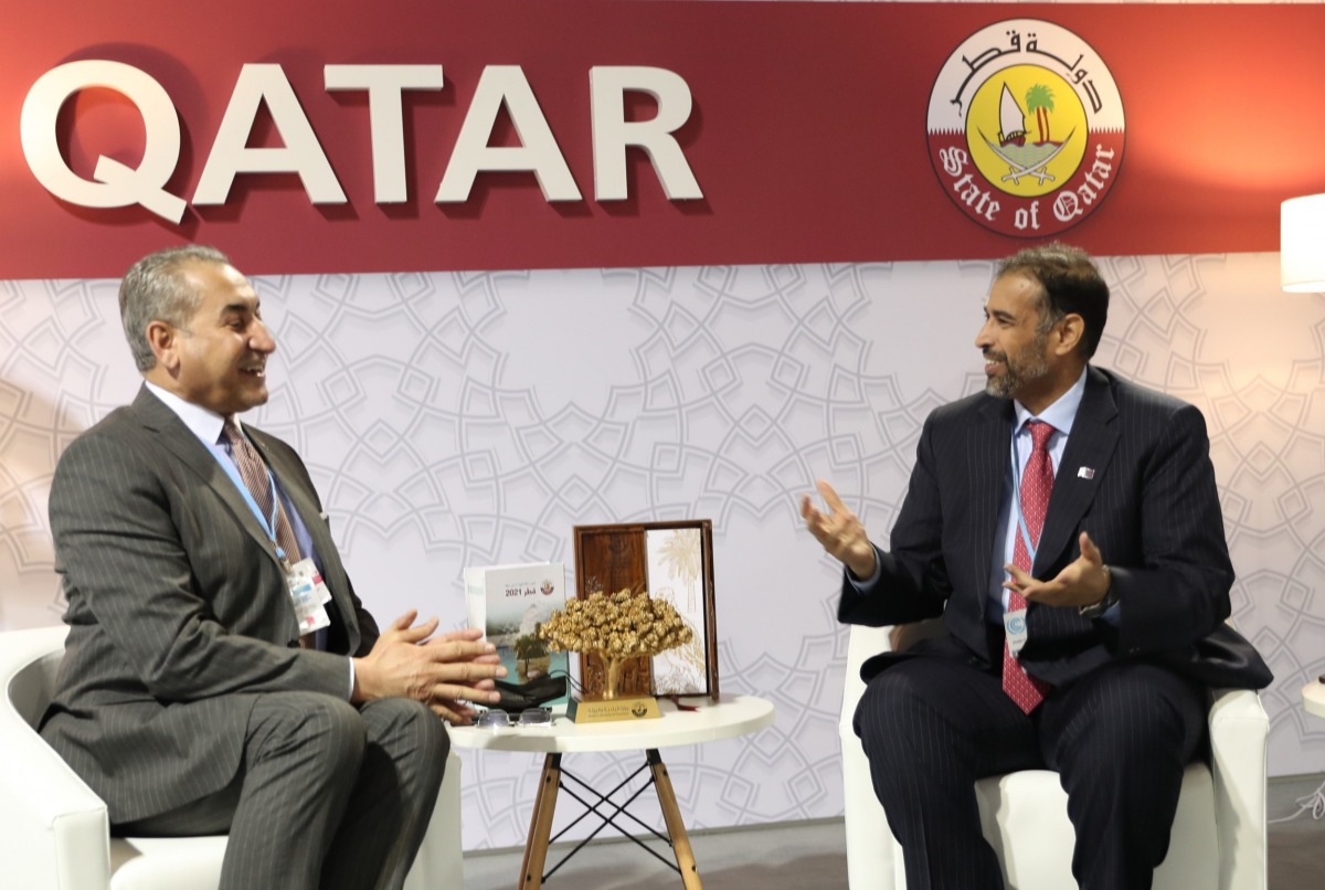 اجتمع سعادة الشيخ الدكتور فالح بن ناصر بن أحمد بن علي آل ثاني وزير البيئة والتغير المناخي، مع سعادة السيد ديفيد تيرك نائب وزير الطاقة الأمريكي خلال زيارته جناح دولة قطر على هامش المؤتمر الـ26 للأطراف في اتفاقية الأمم المتحدة الإطارية لتغير المناخ المنعقد حاليا في غلاسكو بالمملكة المتحدة.