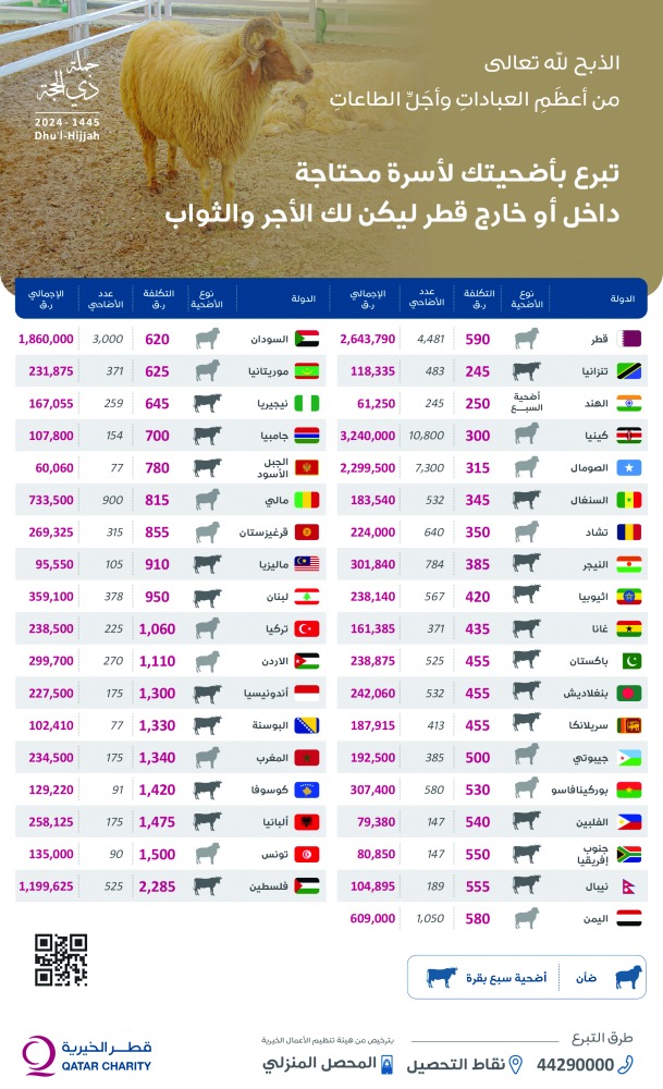 ومن أهم هذه الأمور التبرع لمشروع الأضاحي حيث يتاح للمتبرع أن يختار من خلال التطبيق قيمة الأضحية اعتبارا من 245 ريالا والتبرع بها لأي دولة من 40 دولة حول العالم بما فيها قطر.