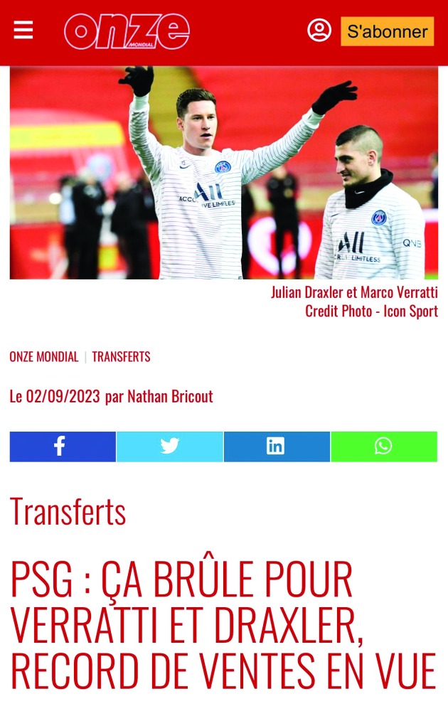 العربي، مشيرة إلى أنه سيلعب في نفس الفريق إلى جانب النجم البرازيلي "رافينيا" بعد أن سبق للثنائي أن لعبا مع بعض في النادي الباريسي، في حين أن مجلة "أونز مونديال" أكدت أن الأيام الأخيرة ستكون ساخنة في سوق انتقالات، وهذا في ظل اقتراب ثنائي باريس سان جيرمان فيراتي