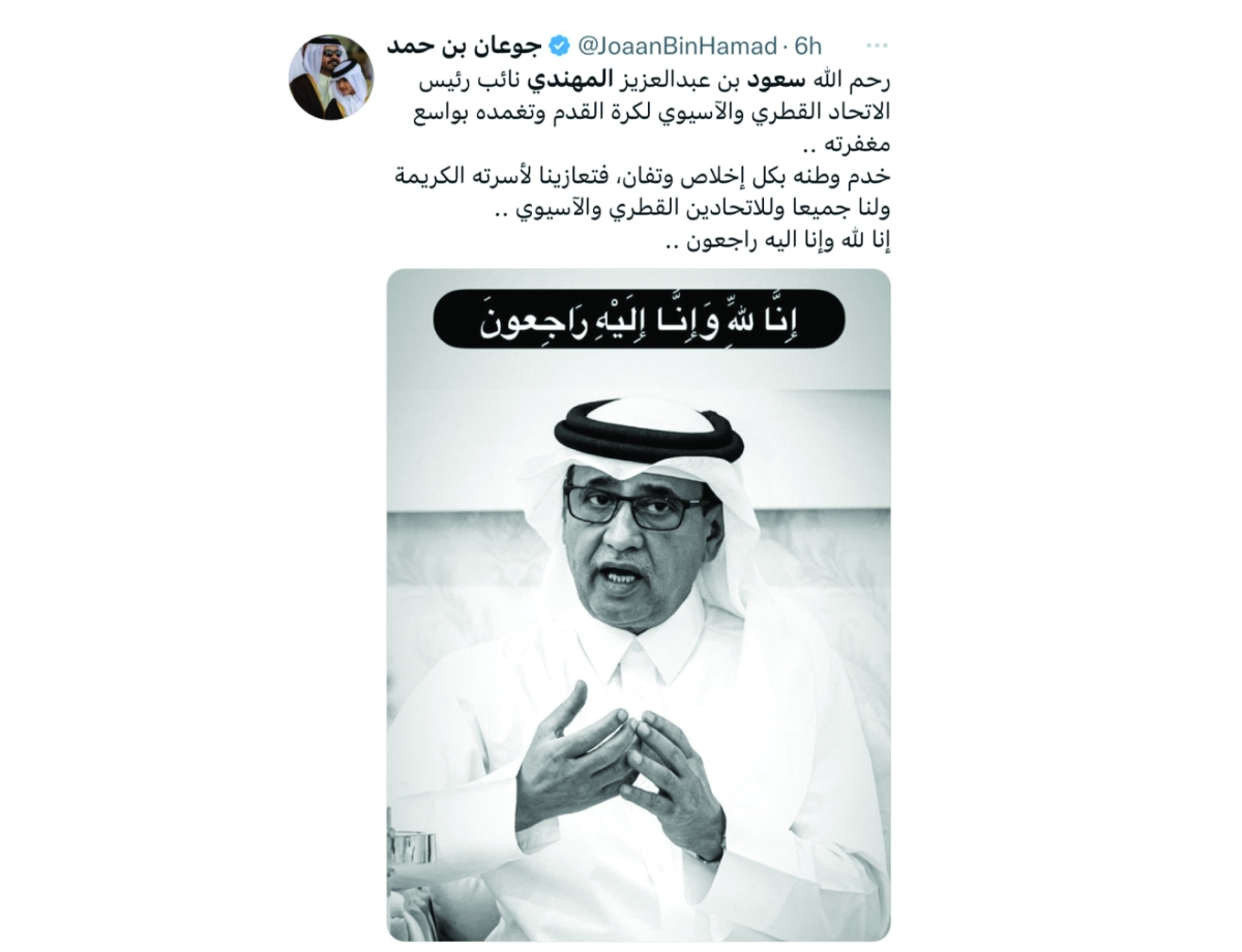 أعلن اتحاد الكرة أمس عن وفاة سعود المهندي عضو الاتحاد الدولي لكرة القدم "الفيفا" ونائب رئيس الاتحادين القطري والآسيوي لكرة القدم، بعد صراع طويل مع المرض، ويعد الراحل سعود المهندي صاحب مسيرة طويلة وحافلة مع كرة القدم القطرية والخليجية والآسيوية والدولية، وبدأ المهندي حياته الكروية كإداري مع نادي قطر، ثم تولى منصب مدير المنتخب القطري ثم تدرج حتى وصل الى مناصب رفيعة قطريا وآسيويا ودوليا.