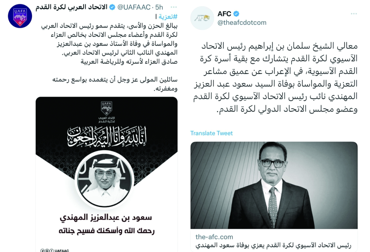 نعى رئيس الاتحاد الآسيوي الشيخ سلمان بن ابراهيم آل خليفة، المهندي الذي يشغل منصب نائب الرئيس منذ 2015، قائلا "فقدنا أخاً عزيزاً وصديقاً وفياً وقامة إدارية رياضية لم تدخر وسعاً في سبيل خدمة لعبة كرة القدم في القارة الآسيوية"، وأضاف "نستذكر بكل التقدير دور المرحوم المهندي في تطوير كرة القدم القطرية، بالإضافة إلى تواجده الفعال في عضوية مجلس الاتحاد الدولي"، ونعى بدوره الأمير عبد العزيز بن تركي الفيصل رئيس الاتحاد العربي لكرة القدم، الراحل المهندي، قائلًا: "رحم الله الأخ سعود بن عبد العزيز المهندي رحمة واسعة، وأسكنه فسيح جناته.. خالص العزاء وصادق المواساة لأسرته، ولكل الأشقاء في قطر وللرياضة العربية. إنا لله وإنا إليه راجعون".