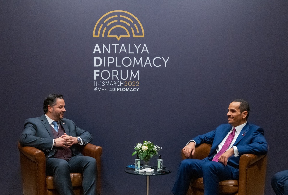 اجتمع سعادة الشيخ محمد بن عبدالرحمن آل ثاني نائب رئيس مجلس الوزراء وزير الخارجية، اليوم، مع سعادة السيد فؤاد محمد حسين وزير خارجية جمهورية العراق، وسعادة السيدة نجلاء المنقوش وزير الخارجية في دولة ليبيا، وسعادة السيد عبدالعزيز كاملوف وزير خارجية أوزبكستان، وسعادة جان أسيلبورن وزير خارجية لكسمبورغ، وسعادة السيد عبدالله بوحبيب وزير الخارجية والمغتربين بالجمهورية اللبنانية، وسعادة السيد أمين سلام وزير الاقتصاد والتجارة اللبناني، وسعادة السيد بيتر ماورير رئيس اللجنة الدولية للصليب الأحمر، كل على حدة، وذلك على هامش مشاركة سعادته في منتدى أنطاليا الدبلوماسي.
