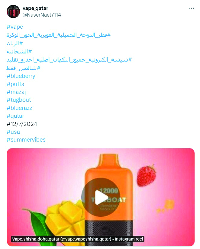 اشتكى العديد من المواطنين وأولياء الأمور من استمرار انتشار مستخدمي الشيشة الإلكترونيه مؤخرا بين أوساط الشباب والمراهقين برغم منع بيعها في الأسواق.. وقالوا لـ الشرق إنه وبالرغم من وجود قرار بمنع بيعها إلا أن المروجين لهذه الآفه الخطيرة ما زالوا يبيعونها بطرق ملتوية واحتيالية للتهرب من مراقبة ورصد الجهات المعنية وذلك عن طريق عرضها في منصات التواصل التابعة لدول مجاورة والتسليم يكون عن طريق عملاء ومندوبين لهم داخل قطر يتكفلون بإيصالها للزبائن، وطالب المواطنون بضرورة تدخل الجهات المعنية والضرب بيد من حديد لكل من تسول له نفسه العبث بأمن وسلامة أفراد المجتمع.