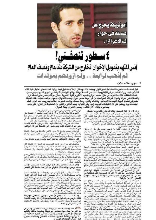 خرج محمد أبوتريكة لاعب الأهلي والمنتخب المصري المعتزل عن صمته وأجرى حوارا مطولا مع صحيفة الأهرام المصرية، وأكد فيه أن هناك بند يحتوي على 4 سطور في عقد الشركة السياحية التي تدور حولها الضجة الحالية تبرئه تماما من الاتهامات التي طالته وتسببت في التحفظ على أمواله، وأن شريكه أنس القاضي المحبوس حاليا تخارج من الشركة منذ عام ونصف نفى فيه الذهاب إلى اعتصام رابعة العدوية مؤكدا أن لم يمد جماعة الإخوان بالمولدات الكهربائية خلال الاعتصام كما زعم البعض.