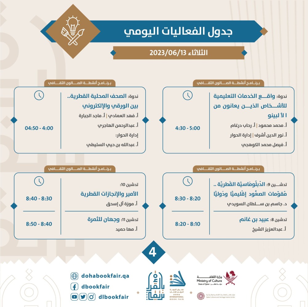 نشر حساب "معرض الدوحة الدولي للكتاب" صباح اليوم عبر تويتر الفعاليات المصاحبة للدورة الثانية والثلاثين للمعرض في يومه الثاني.