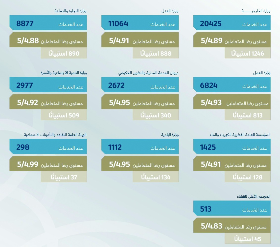 وقامت وزارة التنمية الاجتماعية بإنجاز 2977 معاملة أما المؤسسة العامة القطرية للكهرباء والماء فقد نفذت 1425 معاملة وقامت وزارة البلدية بتقديم 1112 خدمة. أما الهيئة العامة للتقاعد فقد نفذت 298 خدمة. وقام المجلس الأعلى للقضاء بتنفيذ 512 معاملة للجمهور. و قام الديوان بمتابعة جميع الخدمات المقدمة حيث بلغ متوسط رضا المتعاملين 4.9 من 5 بناء على آراء متلقي الخدمات. و بلغ عدد المعاملات في مركز الشمال 137 وفي الظعاين تم انجاز 1541 وفي الخور تم انجاز 1496 معاملة وفي مركز اللؤلؤة تم انجاز 4941 خدمة. أما في مركز الريان فقد تم انجاز 21806 خدمة وفي الهلال تم انجاز 21592 وفي الوكرة تم تنفيذ 4674.