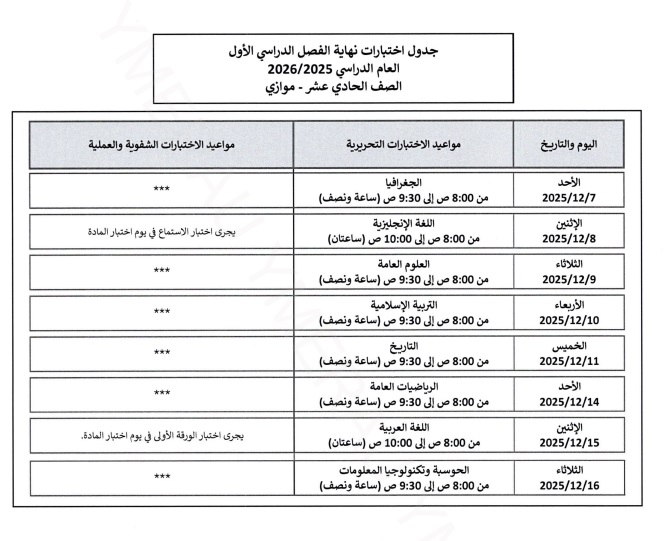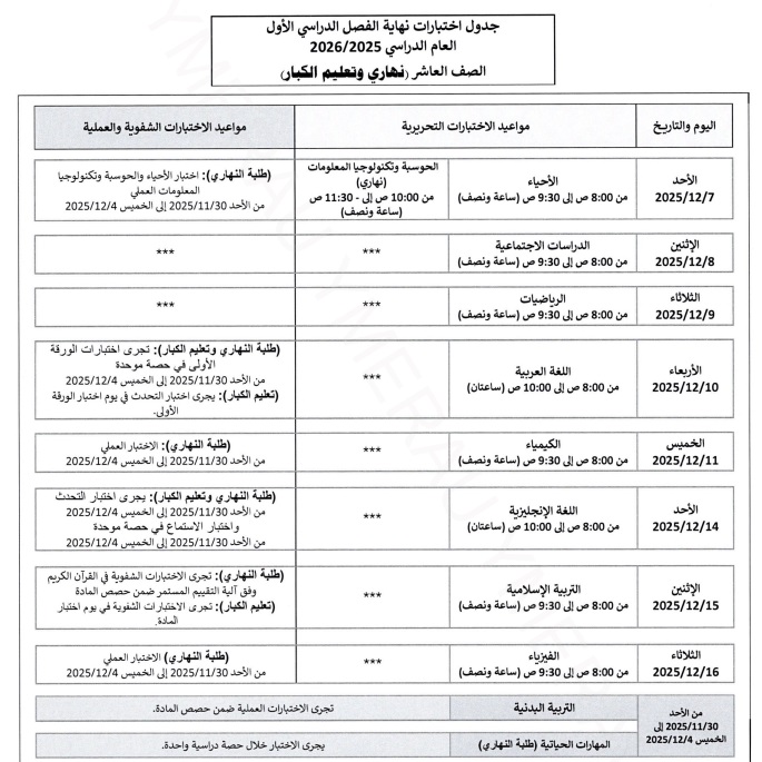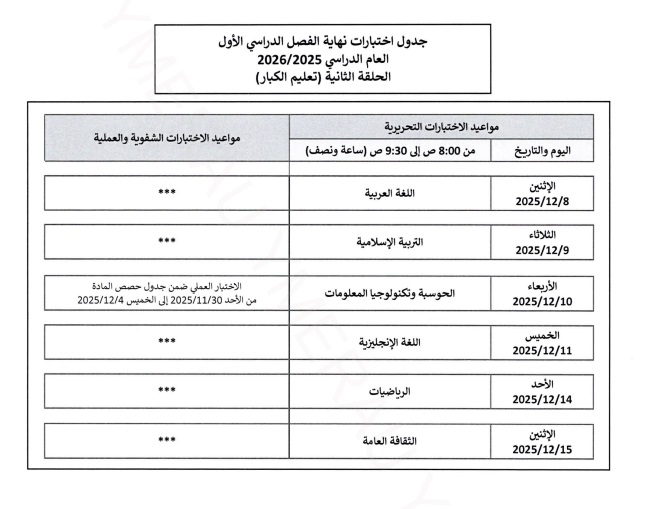أصدرت وزارة التربية والتعليم والتعليم العالي جداول اختبارات نهاية الفصل الدراسي الأول للعام الدراسي 2025-2026 م ، للاختبارات الشفوية والعملية للصفوف من الحلقة الأولى حتى الصف الثاني عشر.
