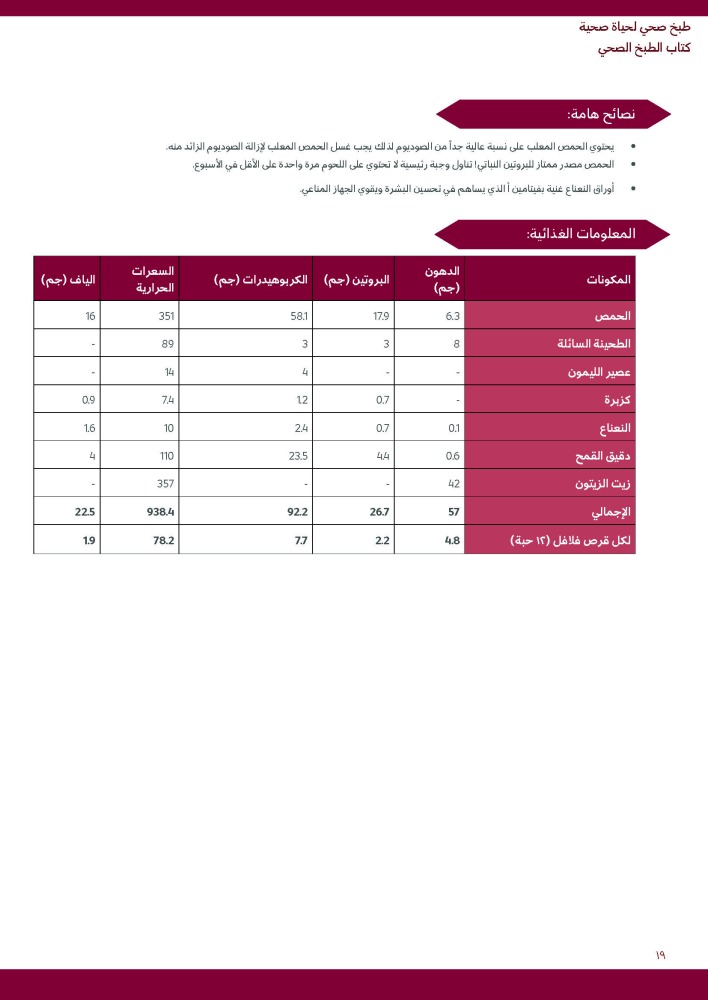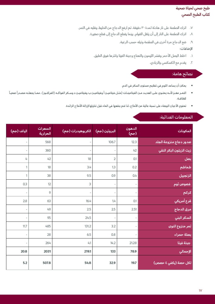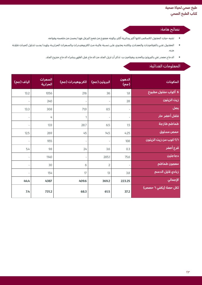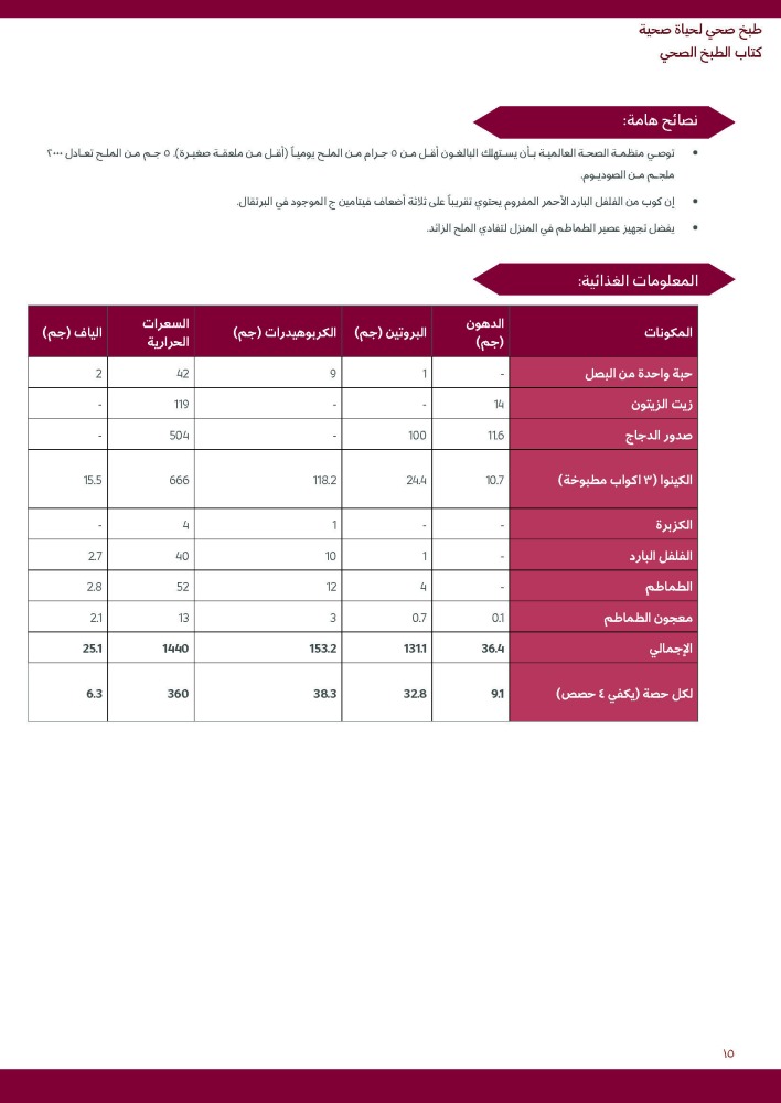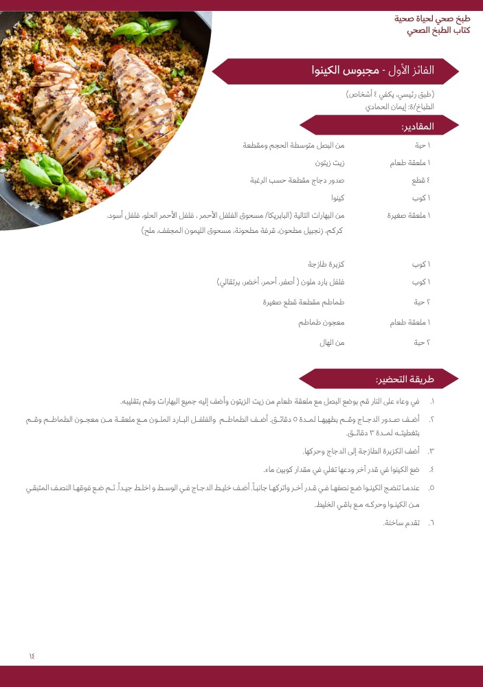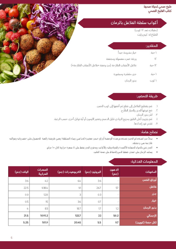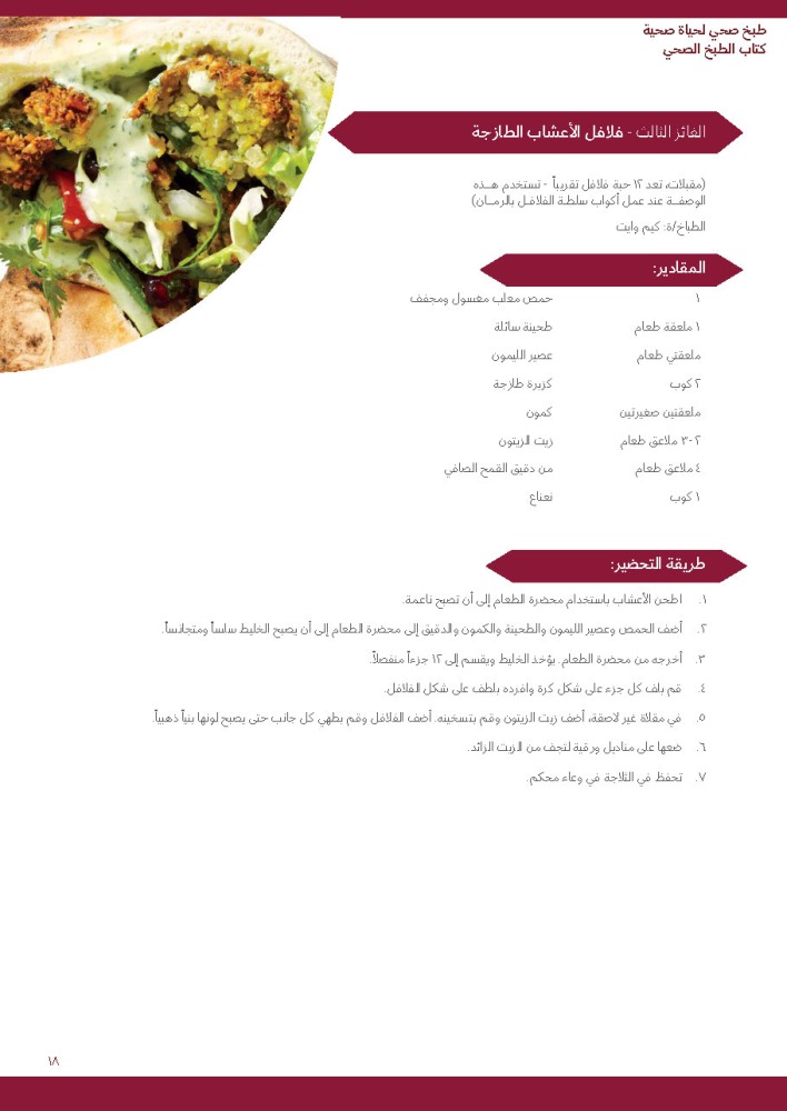 يضم الكتاب، بحسب موقع وزارة الصحة، وصفات الأكل الصحية التي تم اعداداها من قبل الفائزين في مسابقة "طبخ صحي لحياة صحية"، حيث قام أخصائيو التغذية بوزارة الصحة العامة بالتعاون مع منظمة الصحة العالمية بتحليل وصفات الطبخ وتقييمها لاختيار الوصفات الصحية الفائزة ومن ثم تجميعها في كتاب "طبخ صحي لحياة صحية".