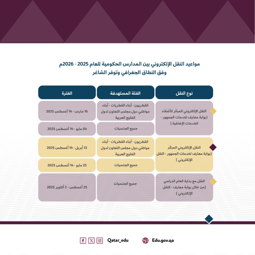 أما تسجيل الطلبة المستجدين ونقلهم بين المدارس الحكومية، فيتم إلكترونياً وفقاً للمعايير المعتمدة التي تشمل فئات القبول، وسن القبول، والنطاق الجغرافي للمدرسة، وتوفر الشواغر.