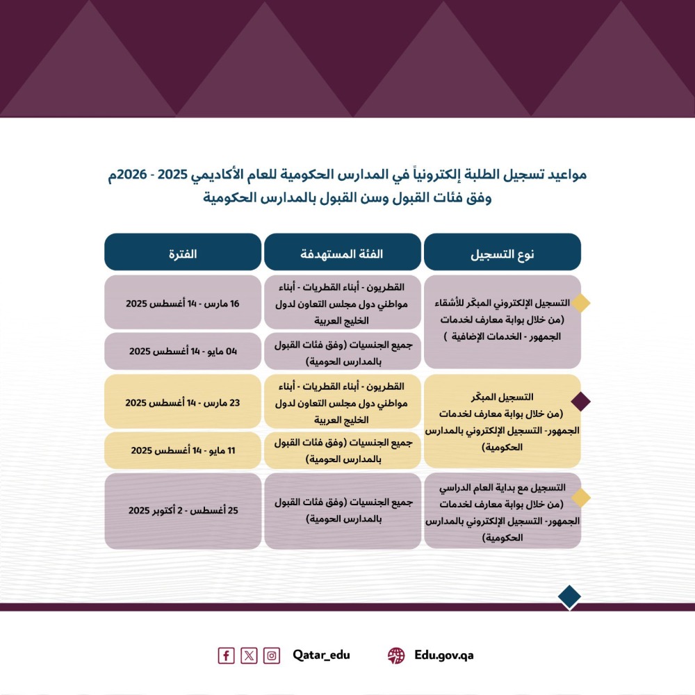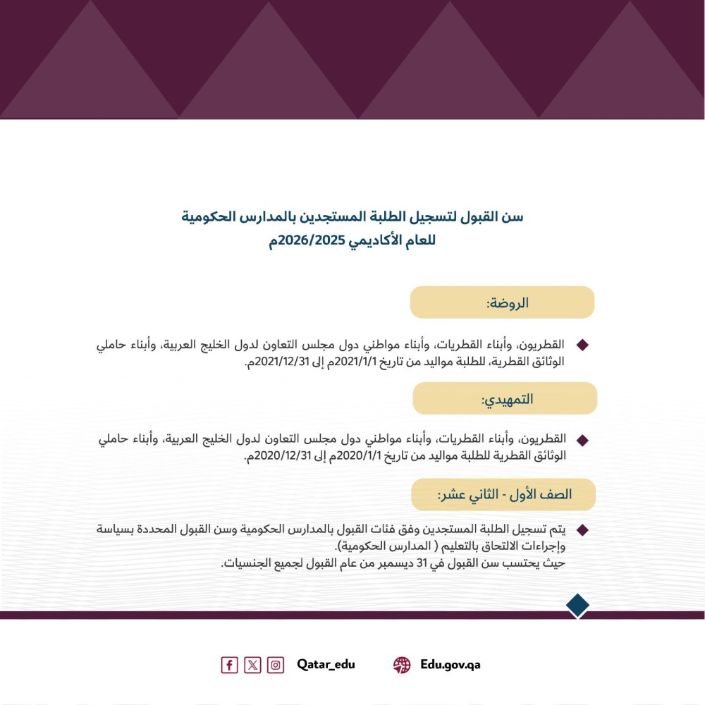 ويتم قبول الطلبة في مرحلة الروضة من الفئات المستهدفة، وهم القطريون، وأبناء القطريات، وأبناء مواطني دول مجلس التعاون، وأبناء حاملي الوثائق القطرية، على أن يكونوا من مواليد الفترة بين 1 يناير 2021 و31 ديسمبر 2021. أما مرحلة التمهيدي، فيُشترط أن يكون الطلبة من نفس الفئات المذكورة، ومولودين بين 1 يناير 2020 و31 ديسمبر 2020. وبالنسبة للصف الأول الابتدائي، فيُقبل جميع الجنسيات وفق فئات القبول المحددة بسياسة وإجراءات الالتحاق، بشرط أن يكونوا من مواليد الفترة بين 1 يناير 2019 و31 ديسمبر 2019. أما التسجيل في الصفوف من الثاني الابتدائي حتى الثاني عشر، فيتم وفق الحدين الأدنى والأعلى للسن، كما هو منصوص عليه في سياسة وإجراءات الالتحاق بالتعليم، مع احتساب العمر حتى 31 ديسمبر من عام القبول.