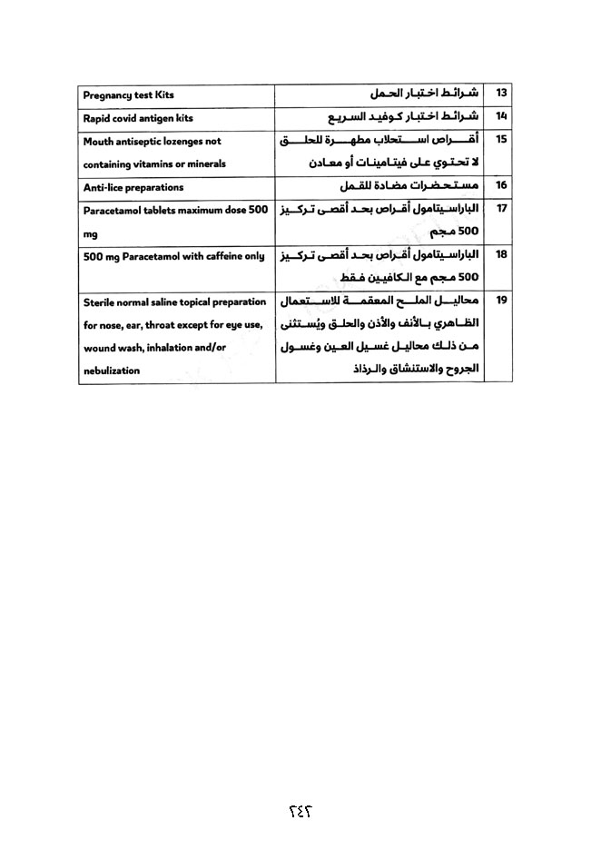 ويشمل القرار 19 منتجاً منها الصابون الطبي، والسوائل المطهرة للجلد ما عدا المركبات التي تحتوي على مادة الإيودين، وغسول الفم، وغسول العين، المستحضرات على شكل كريم أو جل أو مرهم أو لوشن وتستخدم لتخفيف ألم العضلات أو تخفيف أعراض الرشح ونزلات البرد التي تحتوي على المواد التالية فقط مفردة أو مجمعة (المنثول، الكافور اليوكاليبتوس والميثيل ساليسلات)، وزيوت الجلد والشعر بدون ادعاءات طبية، والأقراص المضادة للحموضة مثل الجافيكسون والمالوكس، وشرائط اختبار الحمل، وشرائط اختبار كوفيد السريع، والباراسيتامول أقراص بحد أقصى تركيز 500 مجم، ومحاليل الملح المعقمة للاستعمال الظاهري بالأنف والأذن والحلق ويًستثنى من ذلك محاليل غسيل العين وغسول الجروح والاستنشاق والرذاذ.