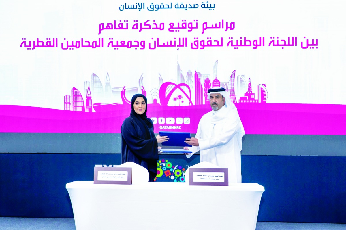 وقد وقعت سعادة السيدة مريم بنت عبد الله العطية رئيس اللجنة، على هامش فعالية اليوم القطري لحقوق الإنسان، مذكرة تفاهم مع جمعية المحامين القطرية تتويجاً وترسيخاً لمبدأ التعاون المشترك، وسعياً لإقامة دولة القانون والعدالة والكرامة. وقع مذكرة التفاهم من جانب جمعية المحامين السيد مبارك بن عبد الله السليطي رئيس مجلس إدارة الجمعية.