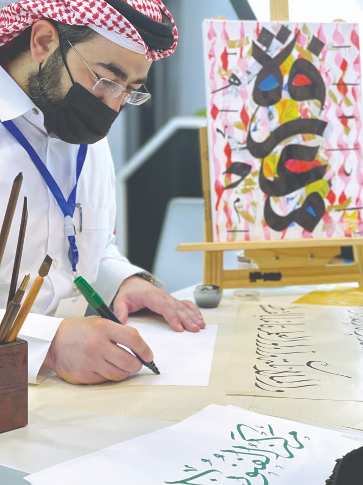 وأضاف أن هناك العديد من الآيات والأحاديث التي كتبت تحت شعار المعرض لهذه السنة، والمتمثل بعبارة "العلم نور"، كما أن هناك العديد من الهدايا التي يتم تقديمها للزوار الذين يحبون كتابة أسمائهم بمختلف الخطوط.
