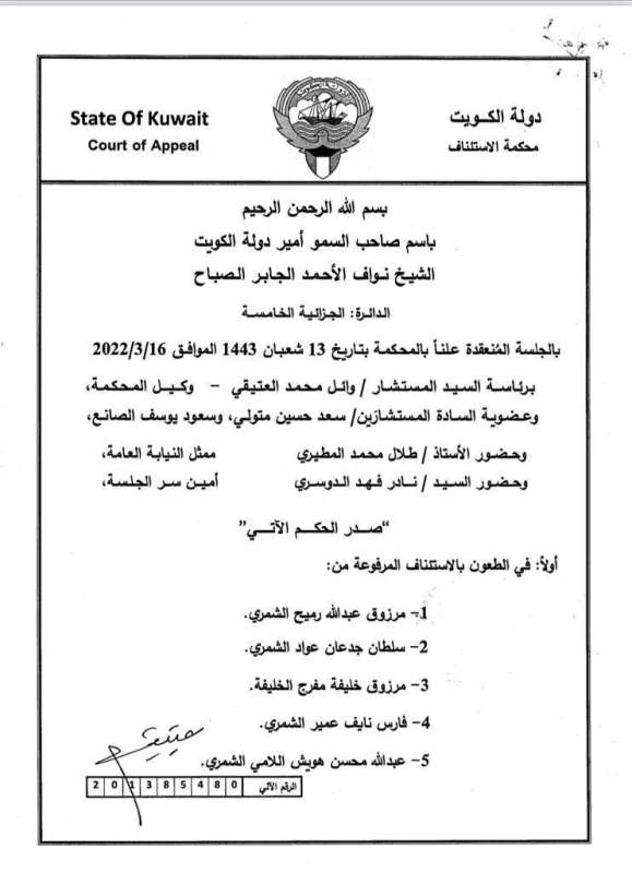 وسبق لمحكمة الجنايات، برئاسة المستشار نايف الداهوم، أن قضت في قضية فرعية قبيلة شمر في الدائرة الرابعة، المتهم فيها 29 شخصًا، بحبس النائب مرزوق الخليفة وسلطان اللغيصم و6 آخرين سنتين مع الشغل، وكفالة 5 آلاف دينار لوقف النفاذ، وببراءة باقي المتهمين.