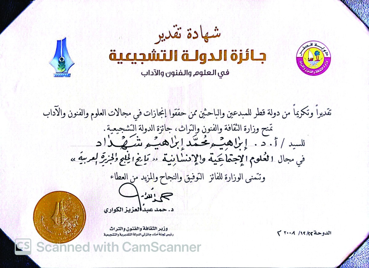 في عام 2008 حصلت على جائزة الدولة التشجيعية في مجال العلوم الاجتماعية والإنسانية، مناصفة مع الدكتور مصطفى عقيل، وقد كنت سعيداً جداً بتلك الجائزة التي أنصفتني وقدرت جهدي والعمل الذي قمت به خلال فترة دراستي وتدريسي للطلبة في الجامعة، في البداية لم تكن لديّ النية للتقديم للجائزة، ولكن الدكتور محمد حسن العمادي (رحمه الله) شجعني على ذلك، ورغم ترددي كثيراً الا أنني في النهاية اقتنعت بعد أن أحضر لي الاستمارة وقمت بملئها، وقدمت بعض ابحاثي التي كانت بعد الدكتوراه، وكان هناك لجنة خاصة تقوم بالتحكيم، وبعد مرور سنة تقريباً اتصل بي الدكتور حمد بن عبدالعزيز الكواري وأبلغني بفوزي مناصفة مع الدكتور العزيز مصطفى عقيل، وفرحت كثيراً لأن هذا إنجاز علمي، وقد كان صعودي لمنصة التتويج للتكريم لحظة لا تنسى ولن تمحى من الذاكرة وقد قام بتسليمي الجائزة صاحب السمو الشيخ حمد بن خليفة آل ثاني الأمير الوالد حفظه الله.