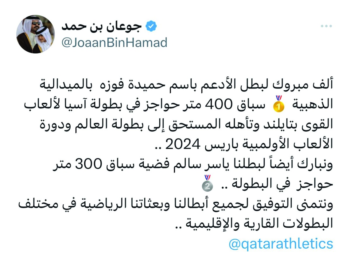 هنأ سعادة الشيخ جوعان بن حمد آل ثاني رئيس اللجنة الأولمبية القطرية بطلنا باسم حميدة على الإنجاز الذي حققه بالبطولة الآسيوية، وقال في تغريدة له على تويتر "ألف مبروك لبطل الأدعم باسم حميدة فوزه بالميدالية الذهبية في سباق 400 متر حواجز في بطولة آسيا لألعاب القوى بتايلند وتأهله المستحق إلى بطولة العالم ودورة الألعاب الأولمبية باريس 2024.. ونبارك أيضاً لبطلنا ياسر سالم فضية سباق 300 متر حواجز في البطولة.. ونتمنى التوفيق لجميع أبطالنا وبعثاتنا الرياضية في مختلف البطولات القارية والإقليمية".