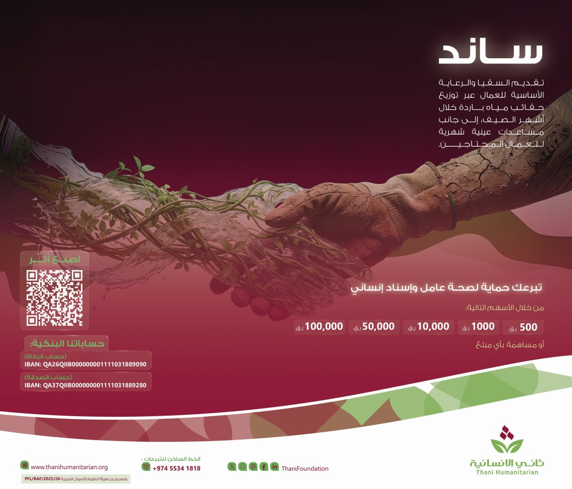 في إطار جهودها المستمرة لتعزيز العمل الإنساني وترسيخ قيم التكافل، تواصل مؤسسة ثاني بن عبد الله الإنسانية العمل على مبادرات نوعية تستهدف الفئات الأكثر احتياجا في المجتمع، حيث يبرز مشروع «ساند» كأحد البرامج الرائدة التي تجمع بين السقيا والرعاية الاجتماعية، في خطوة تهدف إلى التخفيف من الأعباء المعيشية والصحية عن العمال ذوي الدخل المحدود، وتحسين جودة حياتهم اليومية، بما يعكس رسالة المؤسسة في تقديم دعم مستدام يحفظ الكرامة ويصنع أثرا إنسانيا ملموسا.