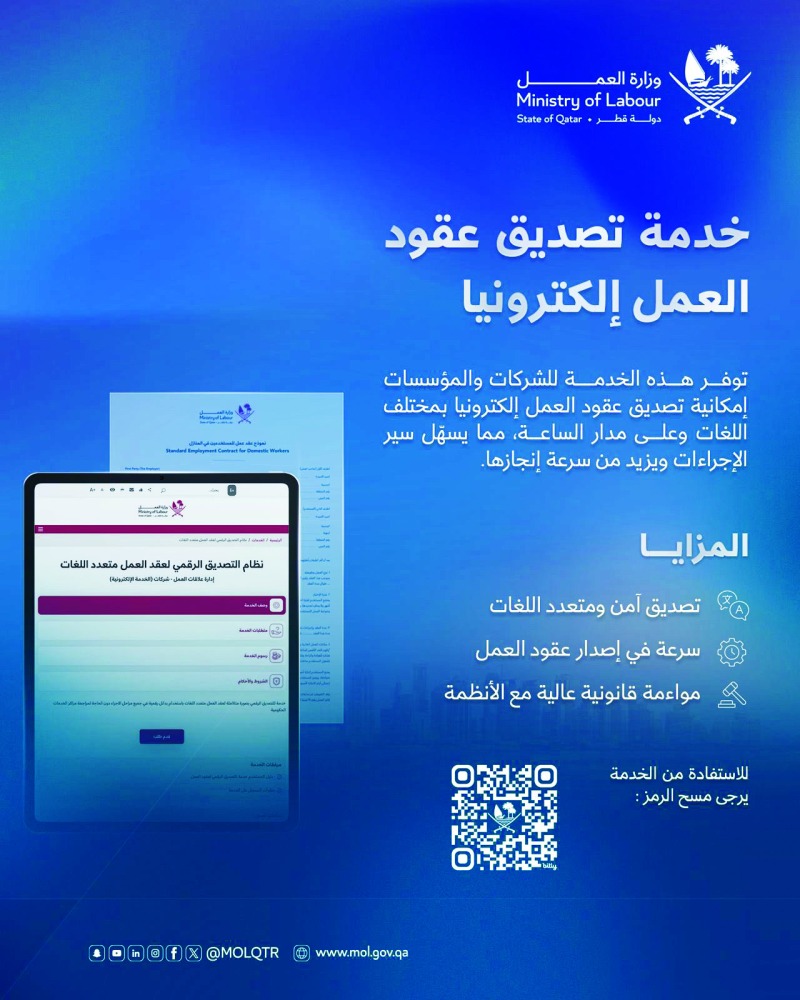 تتيح وزارة العمل خدمة تصديق عقود العمل إلكترونيا، حيث توفر هذه الخدمة للشركات والمؤسسات إمكانية تصديق عقود العمل إلكترونيا بمختلف اللغات وعلى مدار الساعة، مما يسهل سير الإجراءات ويزيد من سرعة إنجازها. وأوضحت الوزارة عبر منشور بمنصة إكس انه ضمن المزايا لخدمة نظام التصديق الرقمي لعقد العمل متعدد اللغات، إنها تعد تصديقا آمنا ومتعدد اللغات، وسرعة في إصدار عقود العمل، إلى جانب مواءمة قانونية عالية مع الأنظمة. وكانت وزارة العمل قد أتاحت بوابة قطاع العمل الإلكترونية لتقديم خدمات رقمية شاملة للمواطنين والمقيمين وأصحاب العمل والعمال والشركات، في إطار مسيرة التحول الرقمي بالوزارة، وتأكيدًا على التزامها بتوفير تجربة مستخدم سلسة وسهلة. تتيح البوابة الجديدة الحصول على مختلف الخدمات في مكان واحد، وبطريقة سريعة، وبكفاءة عالية، مما يسهل الإجراءات ويعزز جودة الخدمات المقدمة.