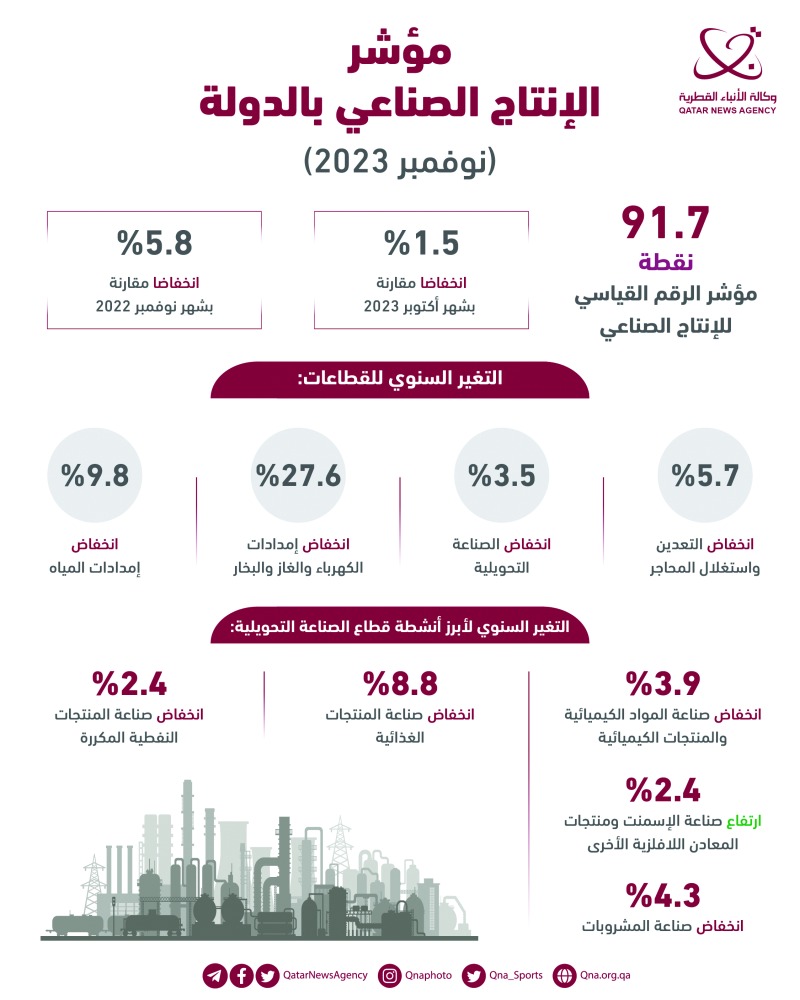 وبالمقارنة مع الشهر المناظر من العام السابق (نوفمبر 2022) يلاحظ انخفاض في قطاع التعدين بنسبة 5.7 بالمائة، يعزى هذا إلى انخفاض الرقم القياسي لمجموعة استخراج النفط الخام والغاز الطبيعي بنفس النسبة، وانخفاض بنسبة 7.6 بالمائة لمجموعة الأنشطة الأخرى للتعدين واستغلال المحاجر. وفي قطاع الصناعة التحويلية أظهرت البيانات انخفاضا قدره 5.2 بالمائة في شهر نوفمبر 2023 مقارنة بأكتوبر 2023، وقد حدث ذلك كمحصلة انخفاض الإنتاج في المجموعات التالية: صناعة الفلزات القاعدية (المعادن الأساسية) بنسبة 9 بالمائة، تلتها صناعة المشروبات بنسبة 7.1 بالمائة، ومجموعة الطباعة واستنساخ وسائط الأعلام المسجلة بنسبة 5.7 بالمائة، وصناعة المنتجات النفطية المكررة بنسبة 5.6 بالمائة، وصناعة المواد الكيميائية والمنتجات الكيميائية بنسبة 5.2 بالمائة، وصناعة منتجات المطاط واللدائن بنسبة 2.6 بالمائة، وصناعة المنتجات الغذائية بنسبة 2.5 بالمائة.. أما بالنسبة للارتفاع فقد حصل في صناعة الإسمنت ومنتجات المعادن اللافلزية الأخرى بنسبة 0.3 بالمائة.