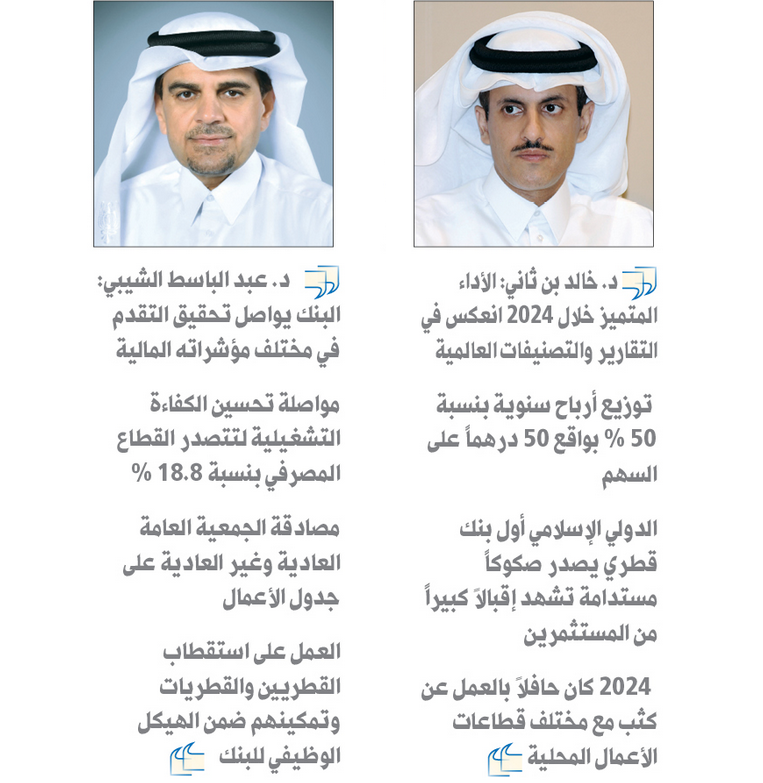 وأضاف سعادة رئيس مجلس الإدارة أن الأداء المتميز الذي حققه الدولي الإسلامي خلال العام 2024، انعكس في التقارير والتصنيفات التي أصدرتها وكالات التصنيف الائتمانية العالمية عبر منح البنك درجات مرموقة، فقد منحت وكالة فيتش البنك تصنيفاً عند درجة (A) مع نظرة مستقبلية مستقرة، كما منحت وكالة موديز تصنيفاً عند درجة (A2) مع نظرة مستقبلة مستقرة، من جانبها صنفت وكالة كابيتال انتلجنس الدولي الإسلامي عند درجة (A+) مع نظرة مستقبلية مستقرة، وقد أجمعت هذه الوكالات على أن الدولي الإسلامي بنك رائد، ويتمتع بربحية قوية إضافة إلى جودة الأصول، والسيولة العالية والمستوى الجيد لكفاية رأس المال وفعالية التكلفة التشغيلية، وهو الأمر الذي يتوقع أن يستمر على المدى الطويل. كما تؤكد نتائج الدولي الإسلامي لعام 2024 أنه يسير قدماً نحو الأمام مستفيداً من قوة الاقتصاد القطري الذي يحقق أفضل النتائج في جميع القطاعات، حيث بلغ إجمالي الموجودات 60.0 مليار ريال قطري بنهاية العام 2024. فيما بلغ إجمالي الإيرادات للبنك 3,519 مليون ريال قطري مقابل 3,055 مليون ريال قطري في نهاية العام الذي سبق، بنسبة نمو 15.2% فيما ارتفع إجمالي حقوق الملكية بنهاية العام 2024 لتصل إلى 9.6 مليار ريال قطري مقابل 9.5 مليار ريال قطري في نهاية العام 2023 بنسبة نمو 1 %. وسجلت كفاية رأس المال بنهاية العام نسبة 19.3% وهو أعلى من المتطلبات التنظيمية مما يشير إلى قوة ومتانة مركز الدولي الإسلامي المالي ولاسيما إزاء مختلف المخاطر المحتملة. وأشار سعادة رئيس مجلس الإدارة إلى أن البنك حقق صافي أرباح بلغت 1,260 مليون ريال قطري مقارنة بمبلغ 1,165 مليون ريال قطري لعام 2023، أي بنسبة نمو 8.2 % فيما بلغ العائد على السهم 0.77 ريال قطري للسهم.